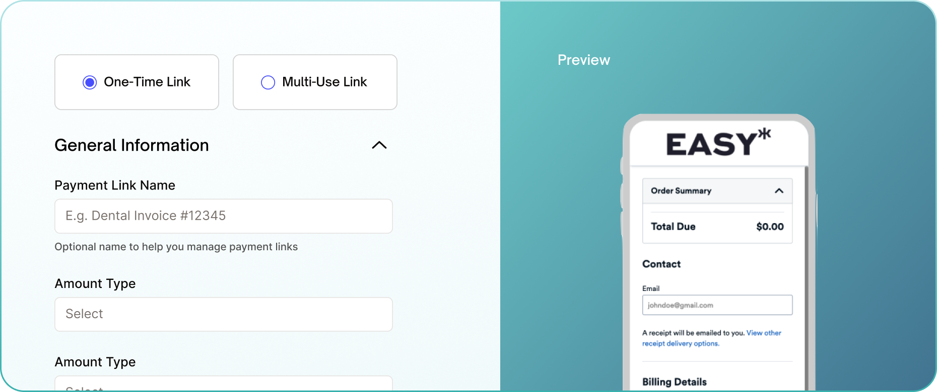 Accept payments without a website. Send a link, take a payment, receive funds—it's that Easy.